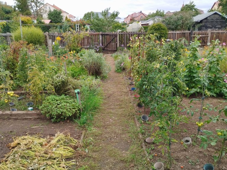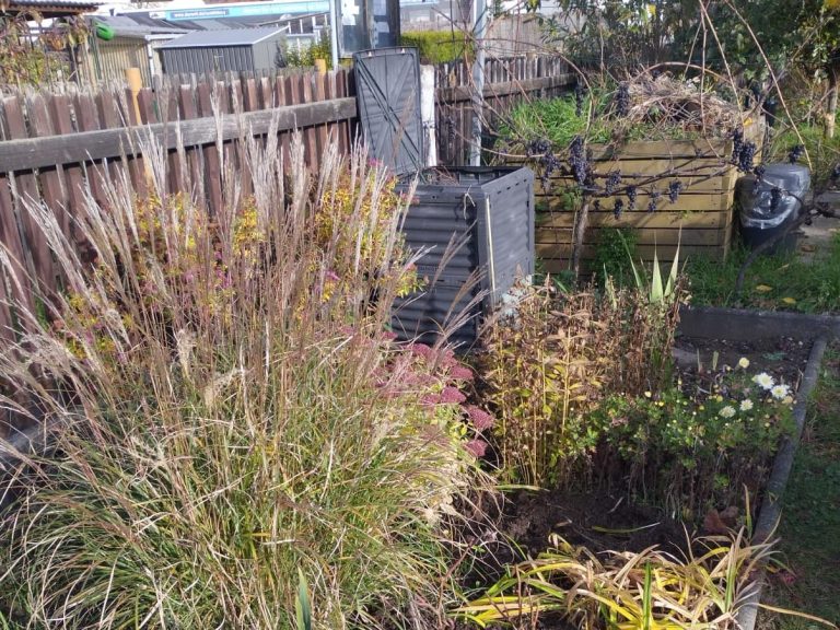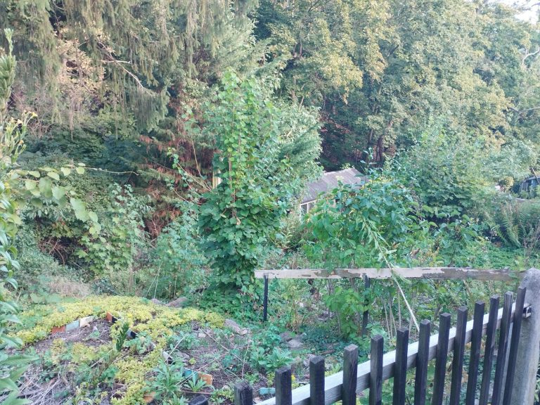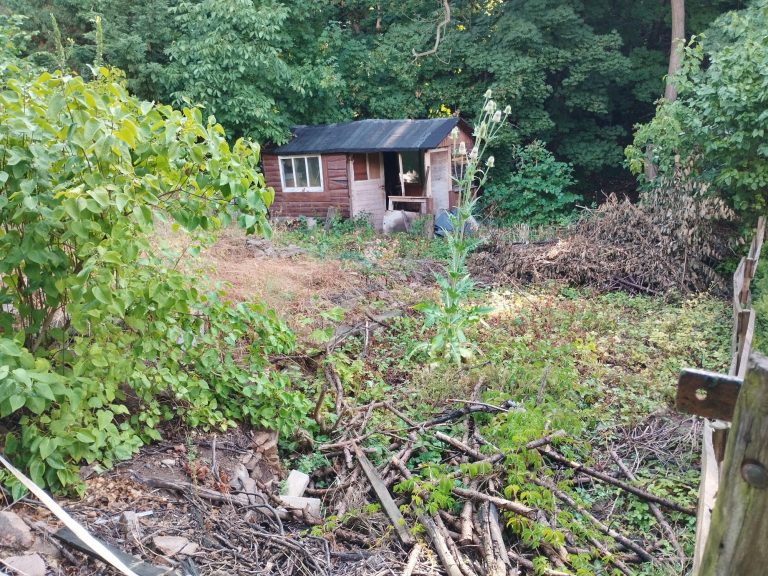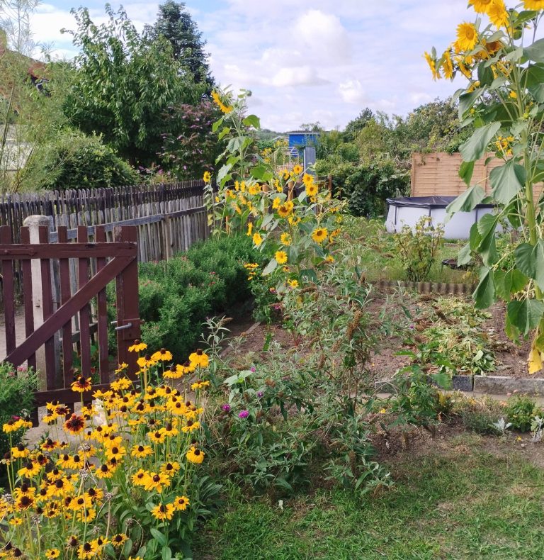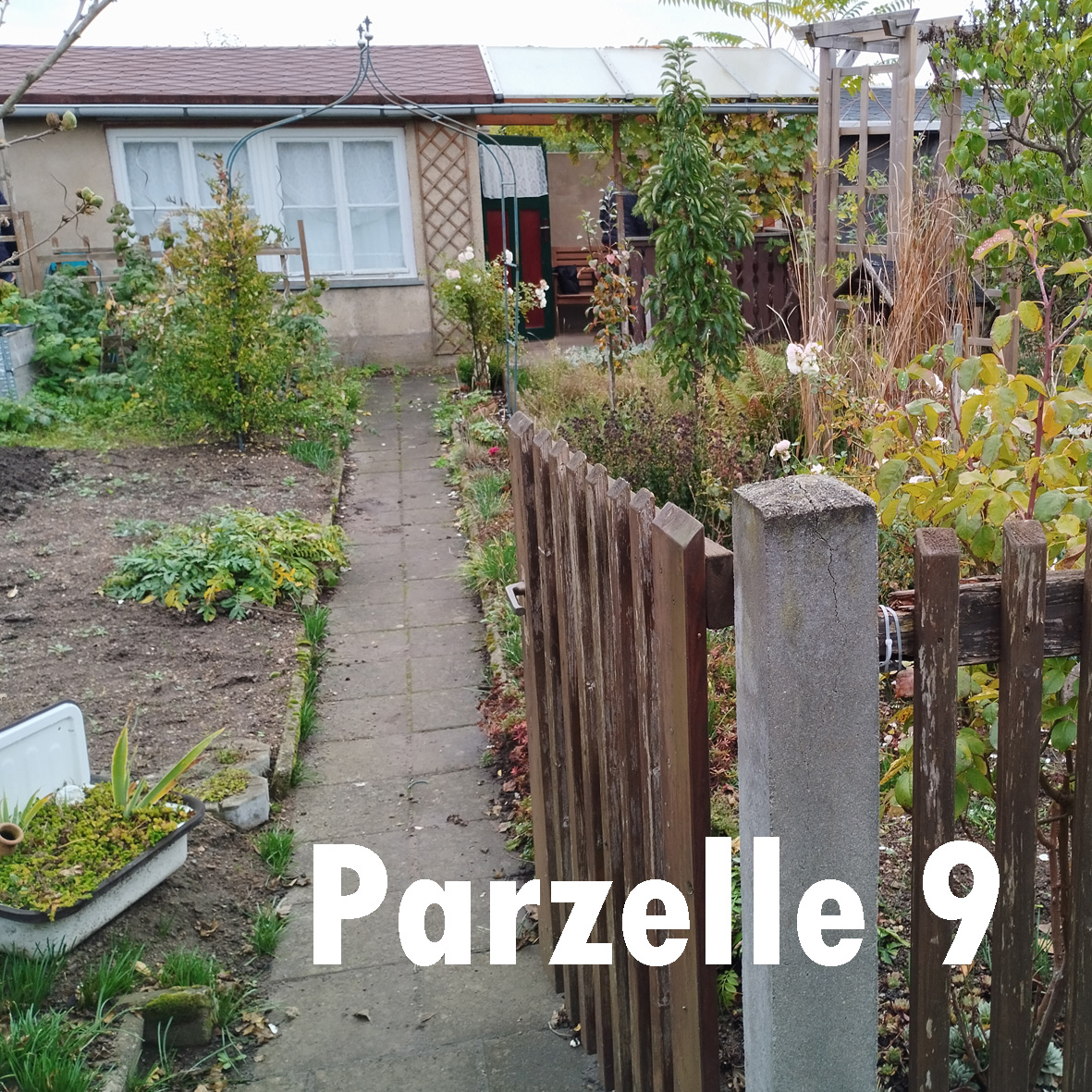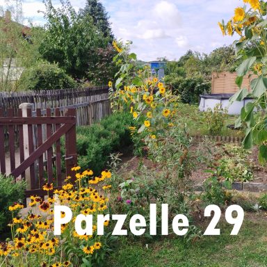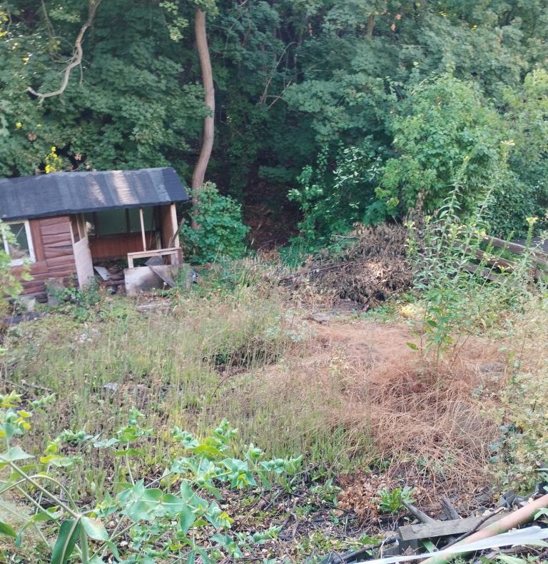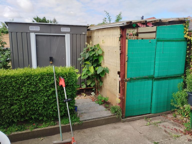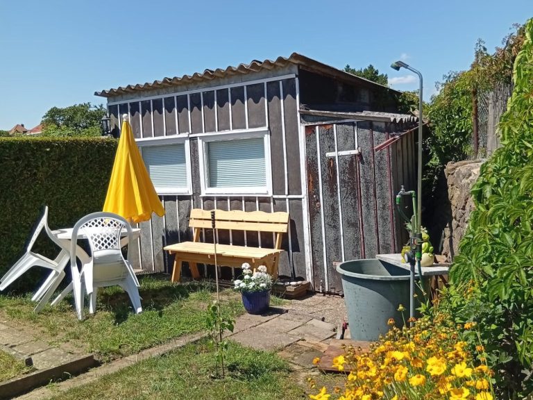 Vorhanden sind eine Gartenlaube aus Holz, sowie ein neuer Geräteschuppen und ein Verschlag für Gerätschaften.