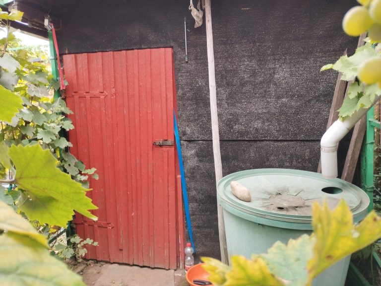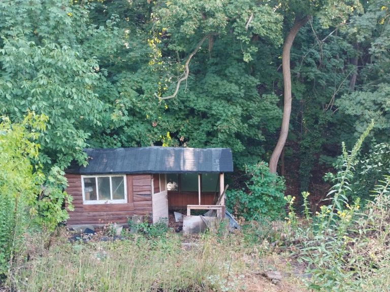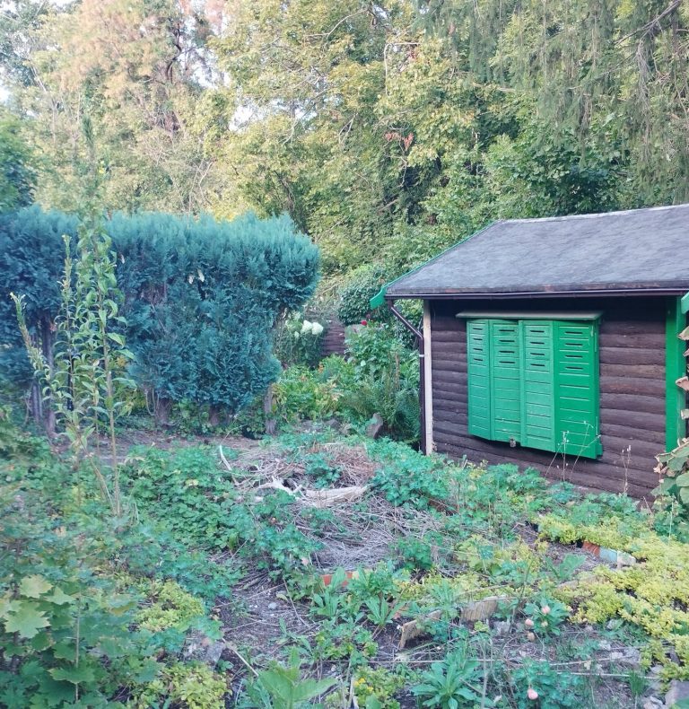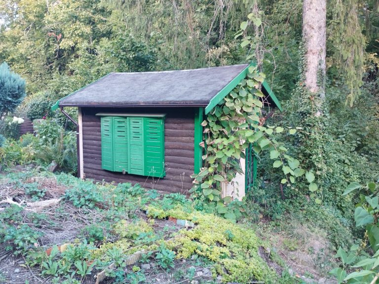 Zudem eine Gartenlaube aus Holz und ein Verschlag für Gerätschaften.