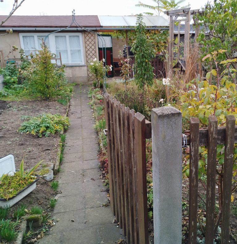 Eine Gartenlaube aus Holz ist vorhanden, evtl. jedoch zum Abriss.